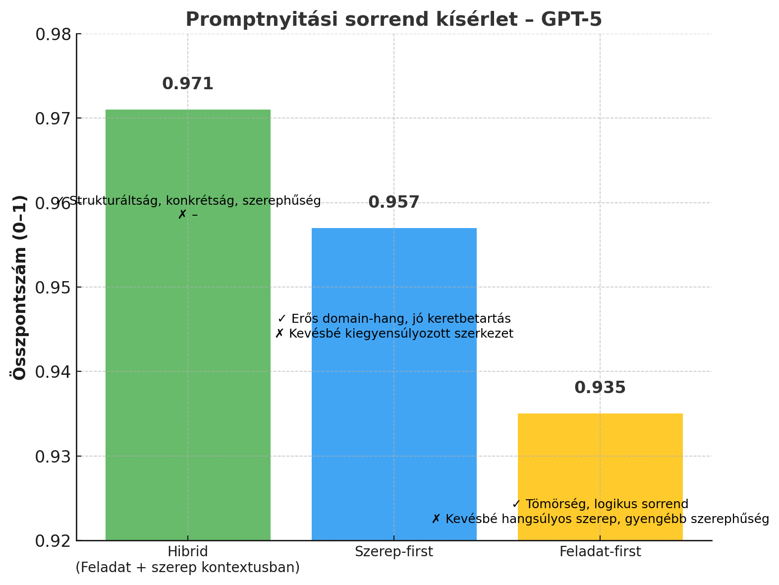 Bár a Hibrid és a Szerep-first megközelítés között a mért különbség mindössze +1,4% volt, ha ezt a kis előnyt következetesen és stratégikusan kihasználjuk, hosszabb távon jelentős kumulatív hatást érhetünk el. Napi szinten ismétlődő feladatok esetén ez a finom előny folyamatosan javíthatja a kimenetek minőségét, és összességében mérhető versenyelőnyt építhet.