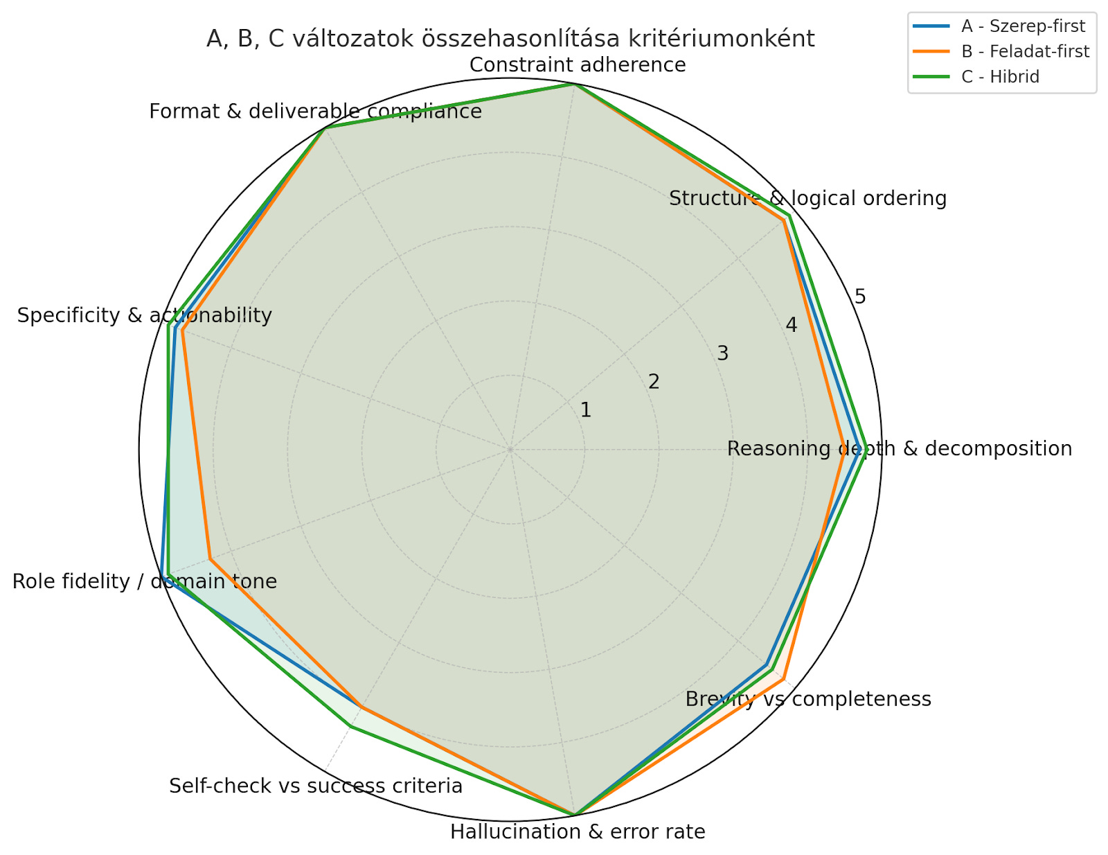 A GPT-5 által generált válaszokat 9 súlyozott kritérium alapján értékeltem: reasoning mélység és bontás, logikai struktúra, kért keretek betartása, formátum követése, konkrétság és végrehajthatóság, szerephűség és domain-hang, önellenőrzés a sikerkritériumokhoz képest, hibaarány és hallucináció, valamint a tömörség és részletesség egyensúlya.